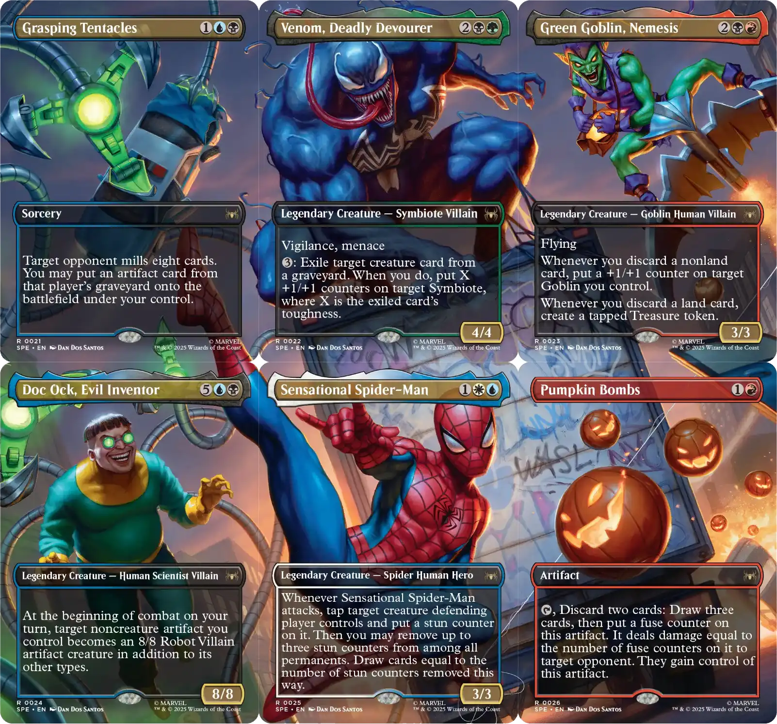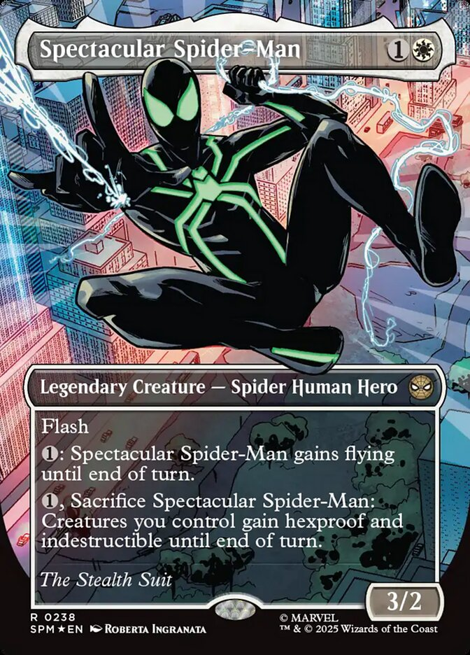 Karta Spectacular Spider-Man vzdává hold mnoha Spideyho kostýmům nošeným během let. Existuje jich celkem sedm, plus jedna verze odpovídající kartě z hlavního setu. Najdete je pouze v Collector Boosterech a jen v textured foil verzi.
