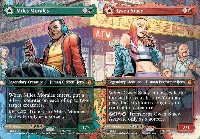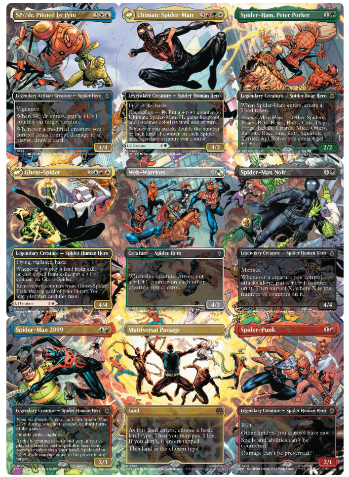 Sety karet tvořící dohromady scénu. Devět jich tvoří dohromady scénu pavoučí party bojující s nepřáteli, lícové strany Milese Moralese a Gwen Stacy k sobě patří také. V Play i Collector Boosterech.